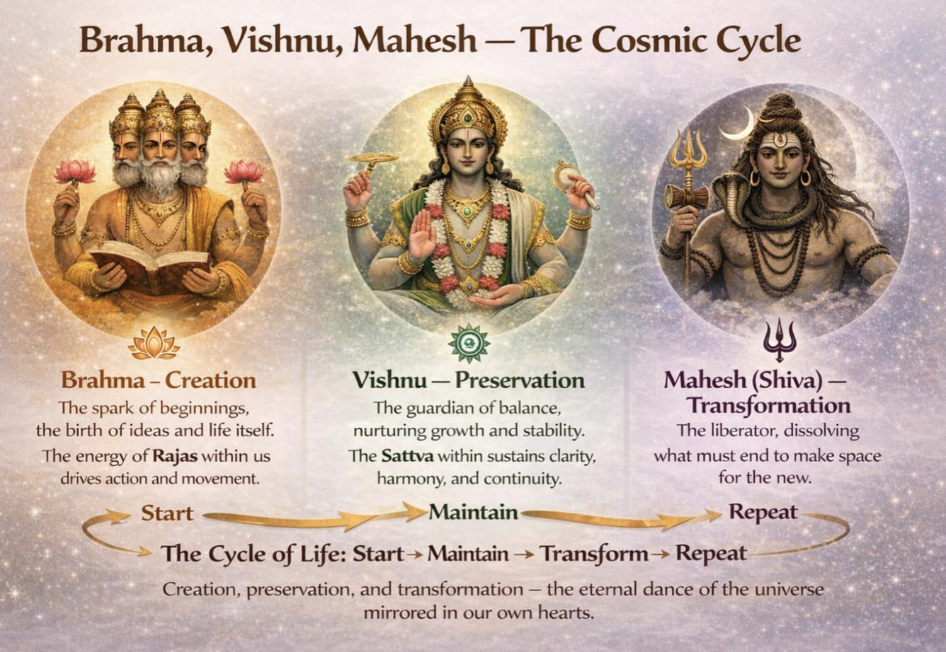 Thần thoại Hindu tồn tại hàng triệu vị thần lớn nhỏ, và hệ thống thần thánh của đạo này khá phức tạp. Trong đó ó 3 vị thần quyền lực nhất trong Hindu giáo (Ấn Độ giáo) được gọi là Trimurti (Tam vị nhất thể), đại diện cho chu kỳ sinh-trụ-diệt của vũ trụ, Họ là bộ ba tối cao, nắm giữ năng lượng điều khiển vũ trụ bao gồm: